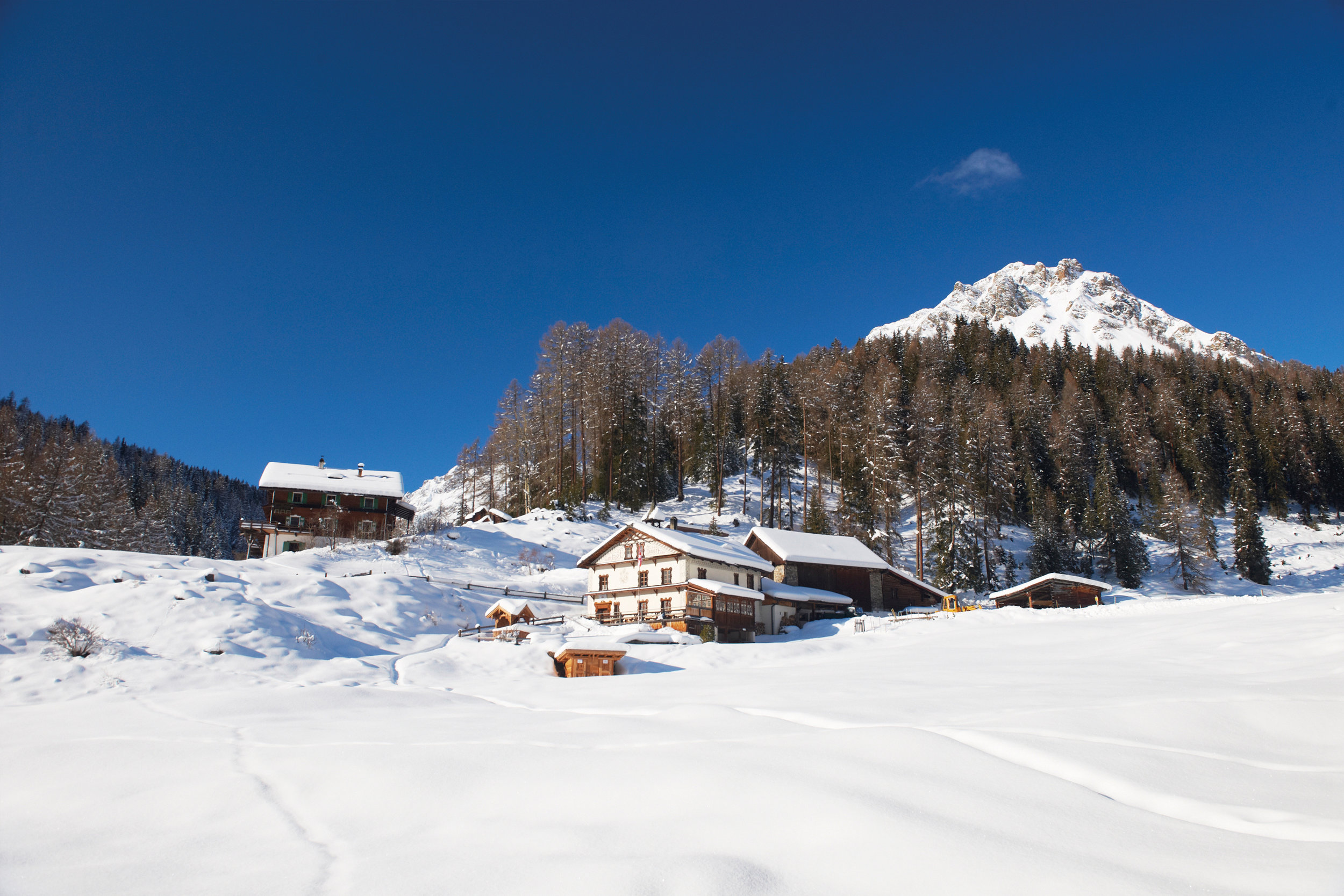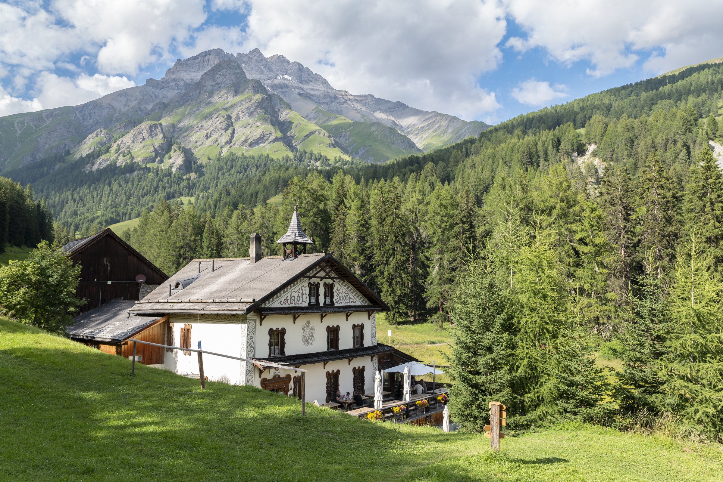 Gasthof und Stall, Chalet und Kapelle sind als Ensemble in Gestalt und Funktion erhalten, heute ist der Hof das ruhigste Swiss Historic Hotel Graubündens. Historisch möblierte Stuben und Gästezimmer befinden sich im ursprünglichen Gasthaus sowie in einem Chalet, das vor über hundert Jahren erbaut worden ist. Das Restaurant bewirtet mit regionalen Köstlichkeiten in der Stube, auf der geschützten Veranda oder auf der Sonnenterrasse. In der Sauna im «Drachenhaus» geniesst man urtümliches Wohlbefinden.